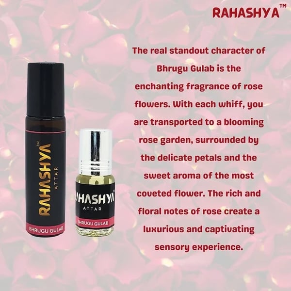Experience the Timeless Allure of Rose through a Bhrugu Gulab by Rahashya. This Exquisite Rose Attar Embodies the Classic and True Essence of Romance and Elegance. The Real Standout Note of Bhrugu Gulab is the Enchanting Fragrance of Rose Flowers. With Each Whiff, You are Transported to a Blooming Rose Garden, Surrounded by the Delicate Petals and the Sweet Aroma of the Most Coveted Flower. The Rich and Floral Notes of Rose Creates a Luxurious and Captivating Sensory Experience. Indulge in the Long-lasting Allure of Bhrugu Gulab, as Its Fragrance Gracefully Lingers for at least 8 Hours to 3 Days. This Ensures that You can Enjoy the Enchanting Aroma of Roses Throughout Your Day, Leaving a Trail of Elegance Wherever You Go.