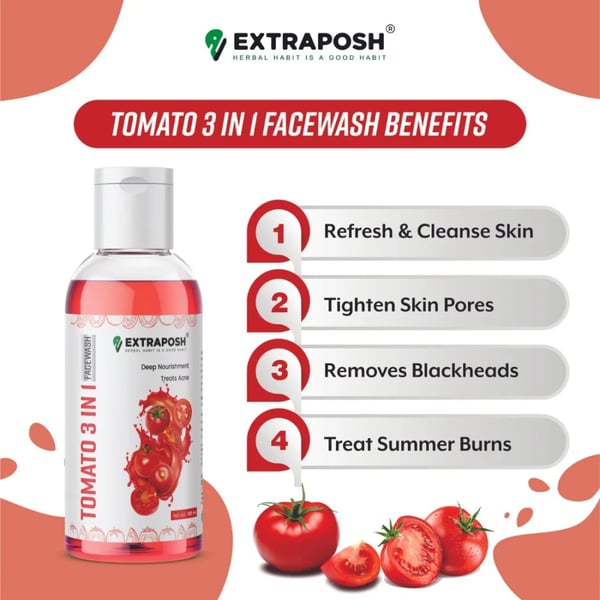 "Tomatoes that are available in almost every kitchen and loved by all, the benefits of tomatoes for skin are really good. It contains several skin-benefiting vitamins and nutrients that can give you the skin of your dreams. It helps treat skin problems related to ageing and sun damage, therefore, making it a great skin rejuvenator. Extraposh Tomato Face wash is the best choice to avail of all these benefits of tomatoes."