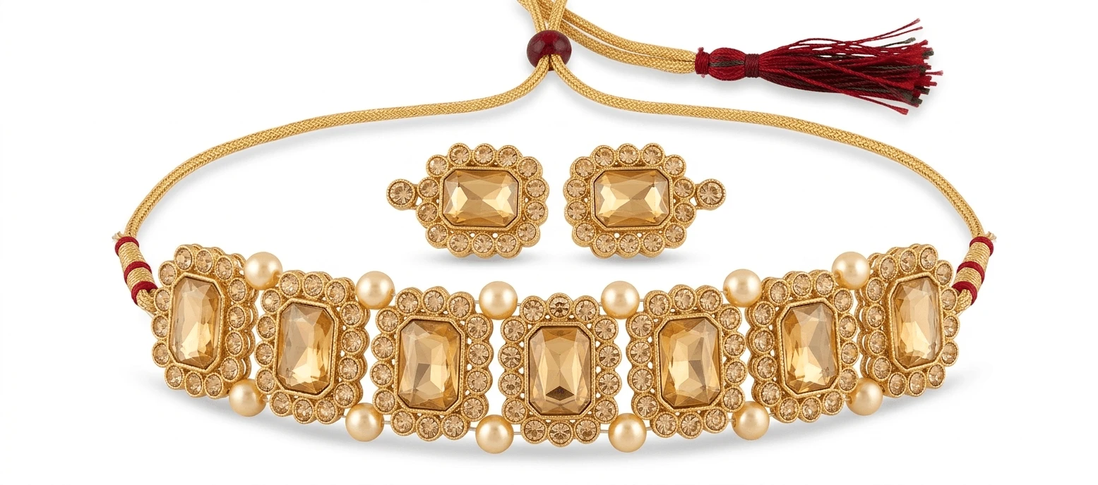 Gold Plated Golden Stone Choker Necklace Set with Earrings for Party Wear