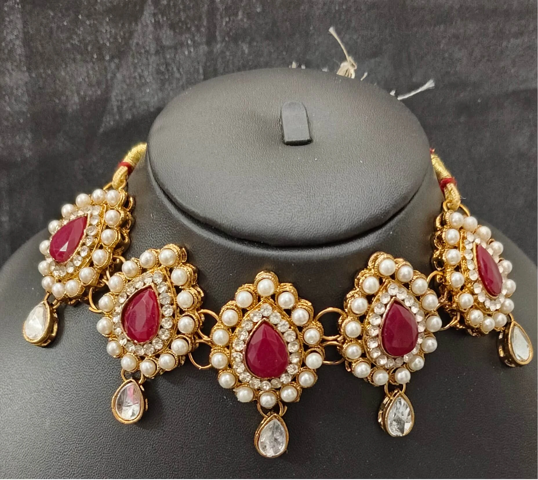 Gold Plated Red Stone Choker Necklace Set for Women - Wedding & Party Wear