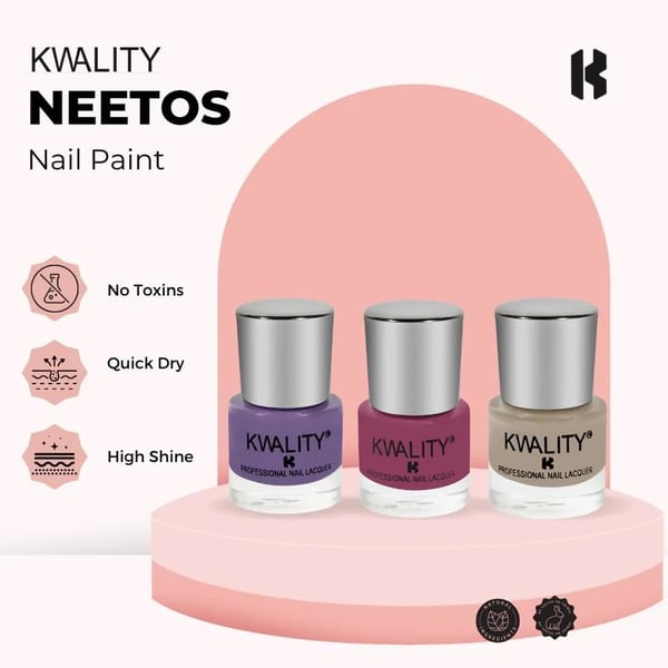 NEETOS Nail Paint Color, Volume: Experience the luxurious feel of Kwality Color Cosmetics Neetos Nail Paint, designed to provide a smooth and shiny finish for your nails. Each purchase includes 4, 8 ml bottles of Neetos Nail Paint, ensuring you have enough product to express your style and creativity.