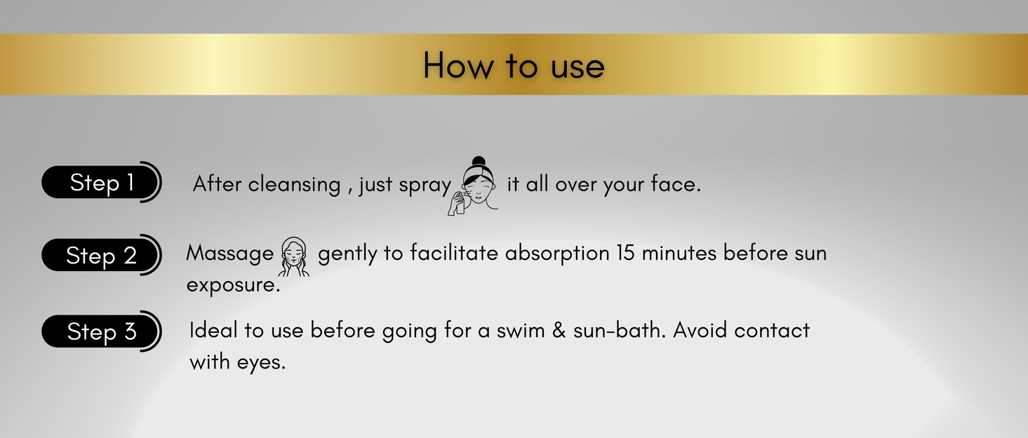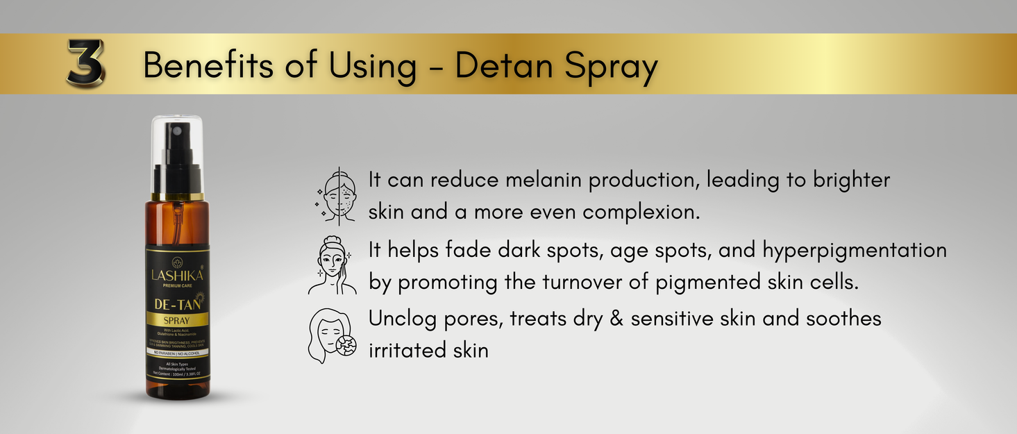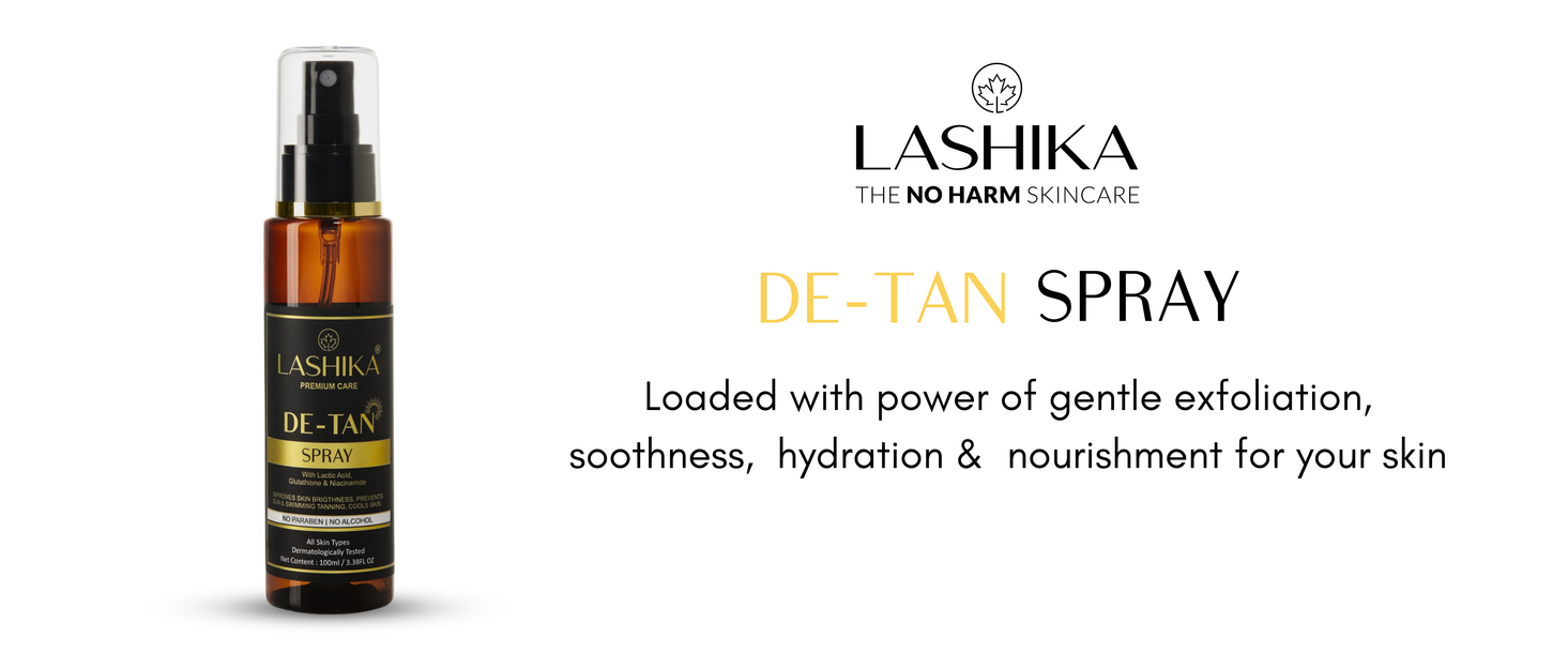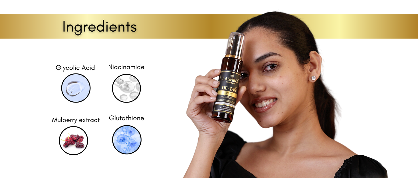 Step 1 - Shake well before use. Apply a small amount of LASHIKA De-Tan Spray onto your skin.