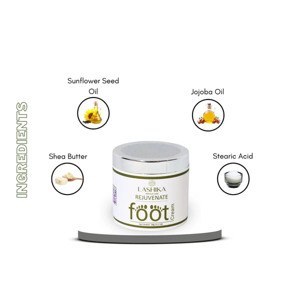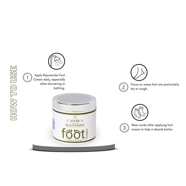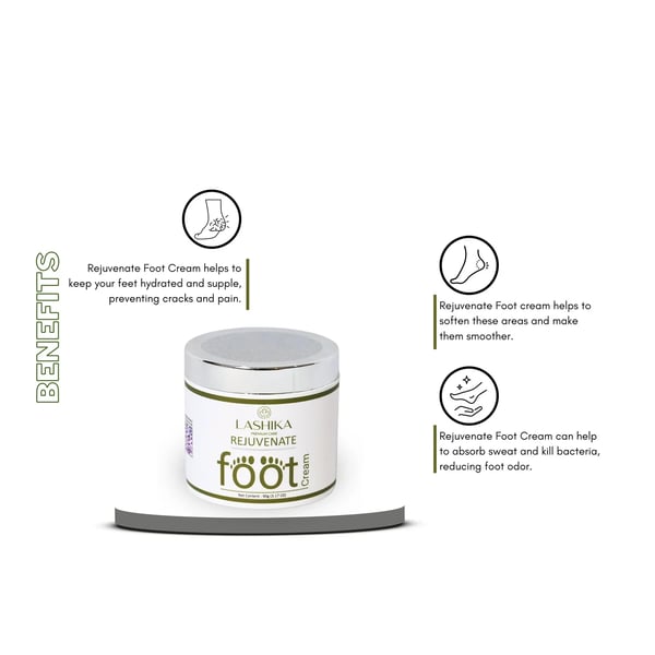 LASHIKA Rejuvenate Foot Cream with stearic acid, sunflower seed oil, shea butter, jojoba oil, almond oil, olive oil, and lavender oil helps prevent dry & cracked skin, soften calluses & rough patches, reduce feet odour, improve blood circulation, prevent infections, relaxes & de-stress and improves overall appearance of the feet.