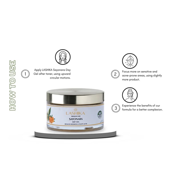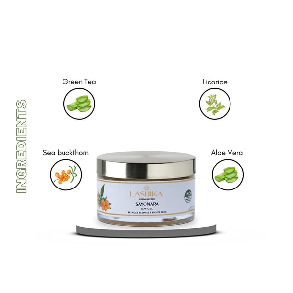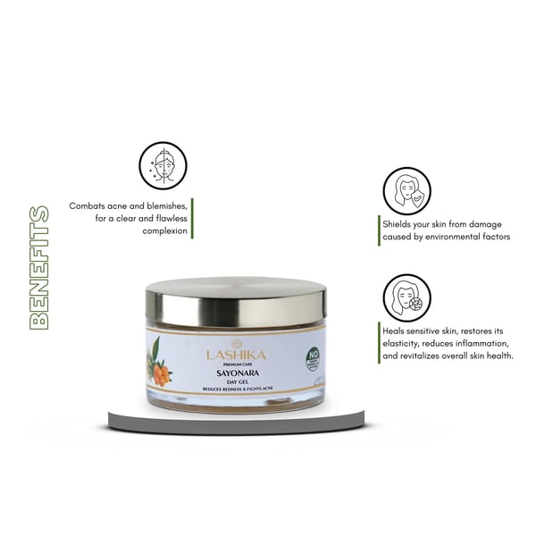An all-day LASHIKA Sayonara Day Gel with the power of key ingredients helps keep skin glowing, free from acne & blemishes, and protects from any skin damage. It helps heal sensitive skin to restore its elasticity, reduce its inflammation, provide glow and restores skin health.