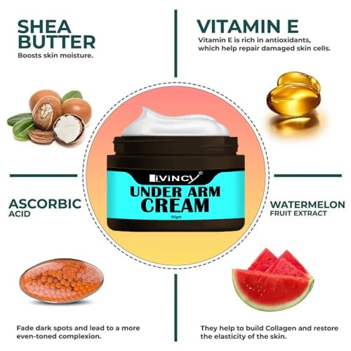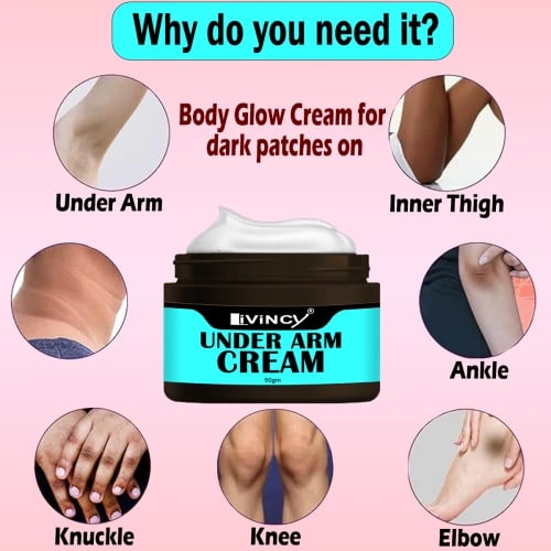 Livincy Underarm Cream. Specially formulated to target dark spots and pigmentation, this cream lightens and evens out the skin tone, giving you the confidence to go sleeveless. Enriched with natural ingredients, Livincy Underarm Cream also provides deep hydration, leaving your underarm skin soft, smooth, and refreshed. Say goodbye to dark, rough patches and hello to visibly brighter and smoother underarms.