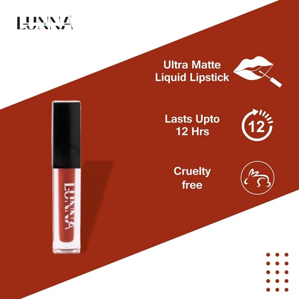 Achieve a bold and beautiful pout with Lunna Matte Finish Liquid Lipstick. This premium brand lipstick boasts an ultra-pigmented formula that delivers a highly saturated color with just one swipe. The long-lasting formula stays put for up to 12 hours, ensuring your lips look flawless all day long. Unlike traditional matte lipsticks, this product features a comfortable matte finish that doesn't feel dry or sticky on the lips. Infused with nourishing ingredients like Vitamin E and jojoba oil, this lipstick keeps your lips soft, hydrated, and healthy. The precise applicator makes it easy to apply the lipstick evenly, even in hard-to-reach areas. Whether you're looking for a bold red or a subtle nude, Lunna Matte Finish Liquid Lipstick has got you covered. Get ready to turn heads with a statement lip that lasts all day!