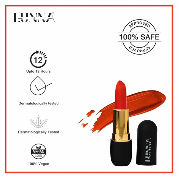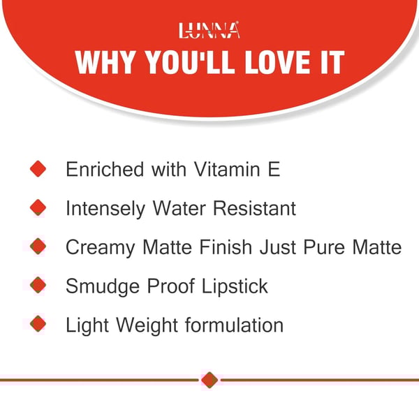 Get all-day wear and moisture-lock with Lunna Long-lasting Matte Lipstick! Our specially formulated lipstick provides up to 12 hours of matte wear without fading or smudging, making it perfect for all-day wear. The smudge-proof and transfer-resistant formula ensures that your lips stay defined and bold without any smudging or transferring. Infused with Vitamin C, Shea Butter, and Vitamin E, our lipstick locks in moisture for up to 8 hours, keeping your lips hydrated and supple. Our formula also enhances the natural plumpness of your lips, giving them a fuller, more defined look. With our safe and non-toxic formula, you can wear our lipstick with confidence. Our formula is dermatologist-tested, sulfate-free, paraben-free, vegan, and cruelty-free, making it perfect for anyone who wants to look and feel their best!