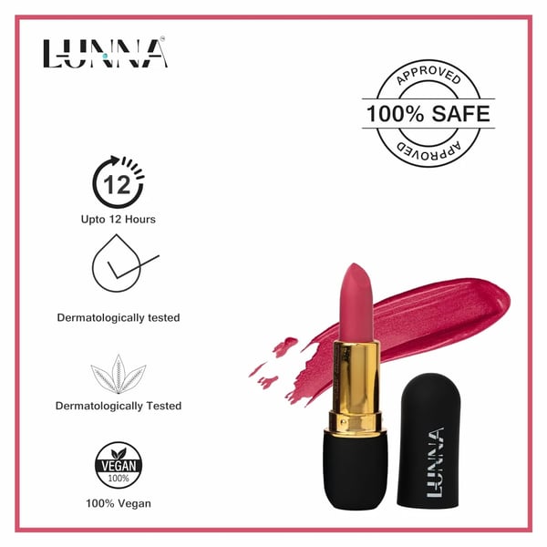 Get all-day wear and moisture-lock with Lunna Long-lasting Matte Lipstick! Our specially formulated lipstick provides up to 12 hours of matte wear without fading or smudging, making it perfect for all-day wear. The smudge-proof and transfer-resistant formula ensures that your lips stay defined and bold without any smudging or transferring. Infused with Vitamin C, Shea Butter, and Vitamin E, our lipstick locks in moisture for up to 8 hours, keeping your lips hydrated and supple. Our formula also enhances the natural plumpness of your lips, giving them a fuller, more defined look. With our safe and non-toxic formula, you can wear our lipstick with confidence. Our formula is dermatologist-tested, sulfate-free, paraben-free, vegan, and cruelty-free, making it perfect for anyone who wants to look and feel their best!