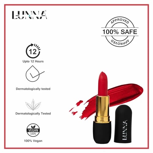 Get all-day wear and moisture-lock with Lunna Long-lasting Matte Lipstick! Our specially formulated lipstick provides up to 12 hours of matte wear without fading or smudging, making it perfect for all-day wear. The smudge-proof and transfer-resistant formula ensures that your lips stay defined and bold without any smudging or transferring. Infused with Vitamin C, Shea Butter, and Vitamin E, our lipstick locks in moisture for up to 8 hours, keeping your lips hydrated and supple. Our formula also enhances the natural plumpness of your lips, giving them a fuller, more defined look. With our safe and non-toxic formula, you can wear our lipstick with confidence. Our formula is dermatologist-tested, sulfate-free, paraben-free, vegan, and cruelty-free, making it perfect for anyone who wants to look and feel their best!