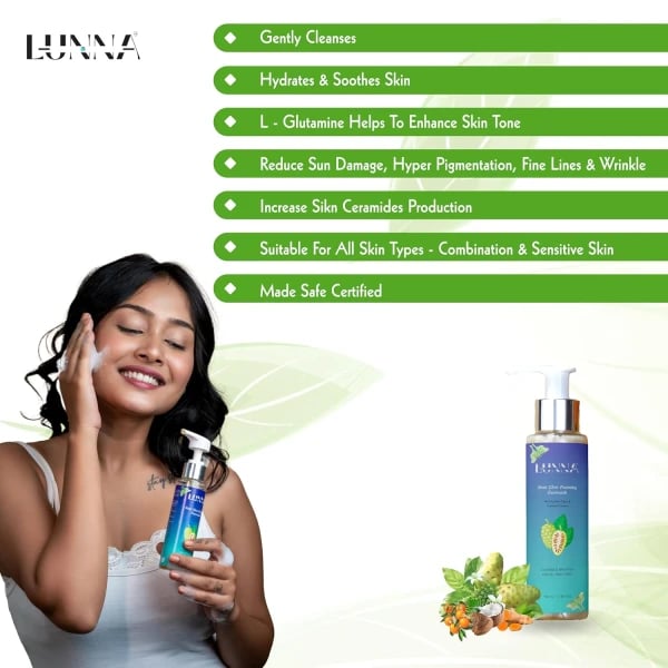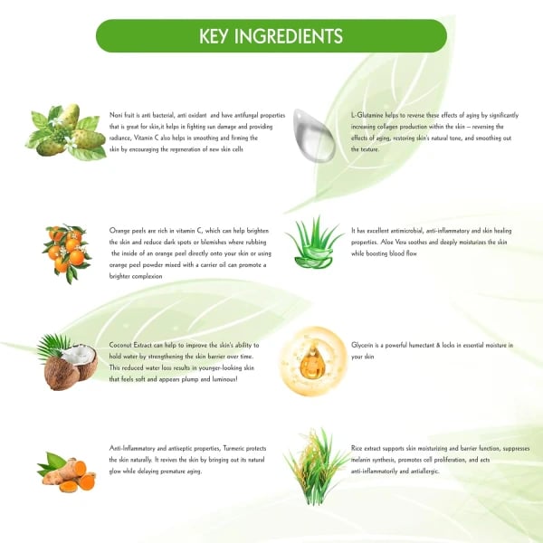 A Refreshing Skin Friendly Gel Cleanser That Transforms Into A Lathering Foam Will Gently But Thoroughly Cleanse Away Visible Dirt ,oil And Other Impurities,noni ,turmeric,aloe,rice,coconut And Orange Peel Extract Work Together To Deeply Cleanse Without Causing Dryness Or Irritation ,leaving Skin Looking Soft,smooth And Radiant .