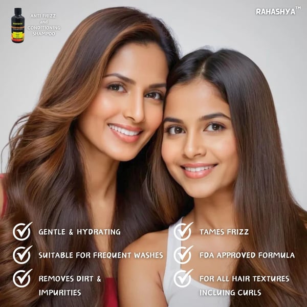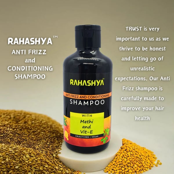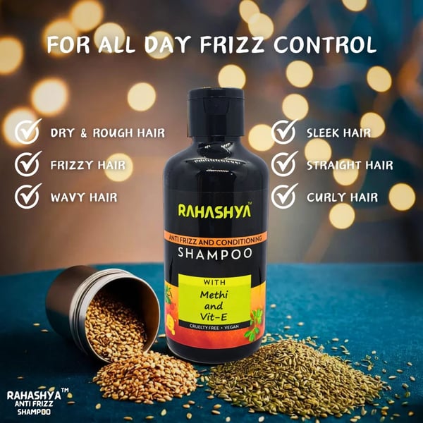 Are frizzy, dry locks ruining your hair days? Rahashya anti frizz shampoo is here to restore your hair's natural shine and beauty. This natural formula nourishes your hair and scalp with: Methi to deeply moisturize each strand, Shikakai to add shine and smoothness, Vitamin E to nourish the scalp. Rahashya shampoo is specially crafted to banish frizziness and dryness for smooth, healthy hair. The natural ingredients moisturize without leaving residue or buildup. Your hair will look naturally soft, smooth, and frizz-free. Who it's for: Rahashya shampoo is perfect for anyone struggling with unruly, frizzy hair. The nourishing formula smooths and moisturizes to give you the beautiful, manageable locks you deserve. Ditch the frizz and enjoy hair that's touchably soft and full of shine. This herbal formula is safe for all hair types.