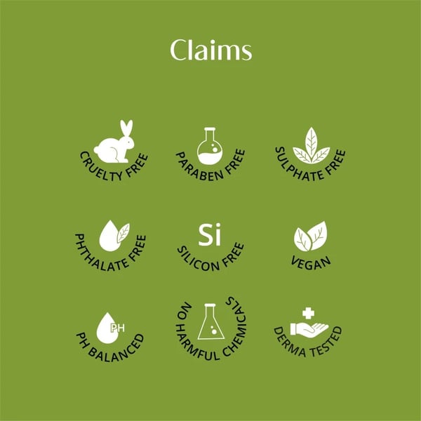 · CLAIMS: Dermatologically Tested, Cruelty Free, Paraben Free, Silicone Free, Phthalate Free, Vegan, pH Balanced, No Harmful Chemicals, Sulphate Free