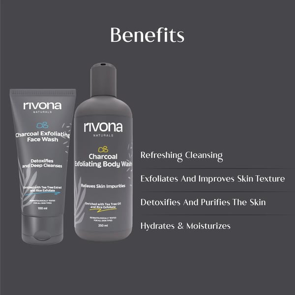 Revitalize your skin with the purifying touch of the Rivona Naturals Charcoal Fresh Detox Duo, a potent combination of Charcoal Exfoliating Body Wash & Scrub (250 ml) and Charcoal Exfoliating Facewash with Scrub (100 ml). Tailored for both men and women, this dynamic duo is enriched with a blend of natural ingredients, including Rice Powder, Activated Charcoal Powder, Aloe Vera Extract, Shea Butter, Argan Oil, and Tea Tree Extract. The activated charcoal in these products acts as a magnet, drawing out dirt and impurities from your skin, leaving it feeling refreshed and rejuvenated. Enjoy a thorough cleanse and achieve a clearer complexion with this invigorating combo.