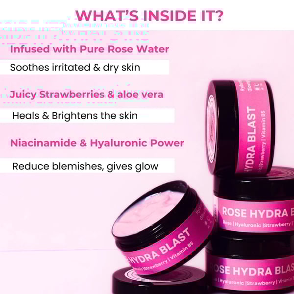 Made with Hyaluronic Acid, Vitamin B5, Strawberry Extract, and Rosewater to hydrate the skin and give a glass skin glow. Made with water gel technology. The formula rich in moisture and gives 48 hours of complete hydration. It can be used in AM & PM routine.