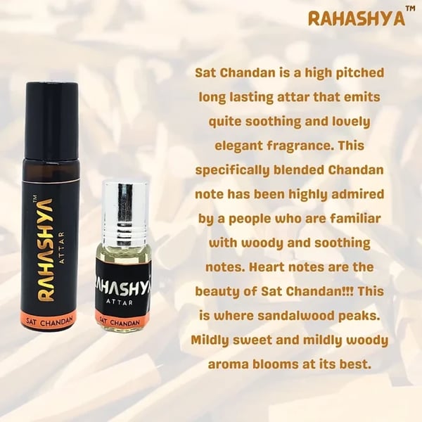 Sat Chandan by Rahashya is a High Pitched and Long Lasting Attar that Emits Quite Soothing and Lovely Elegant Fragrance. This Specifically Blended Chandan Note has been Valued by a People Who are Familiar with Woody and Soothing Notes. Heart Notes are the Beauty of Sat Chandan!!! This is Where Sandalwood Peaks. Mildly Sweet and Mildly Woody Aroma Blooms at Its Best. Sat Chandan Attar is a Tribute to the Oriental Traditions of Veneration of the "Sacred Tree" and an Invaluable Gift to Admirers of It’s Unique, Resinous Woody, Exquisitely-Tart and Heady Aroma. Those who Wear Sat Chandan Attar Discovers New Levels of Spiritual Perfection, Learn and Wonder to the Diversity of Life, Attract Attention and Receive Recognition. Endowed with the Power of Aphrodisiac, It can Bewitch any Heart and Extoll Sensations to the Unprecedented Heights.