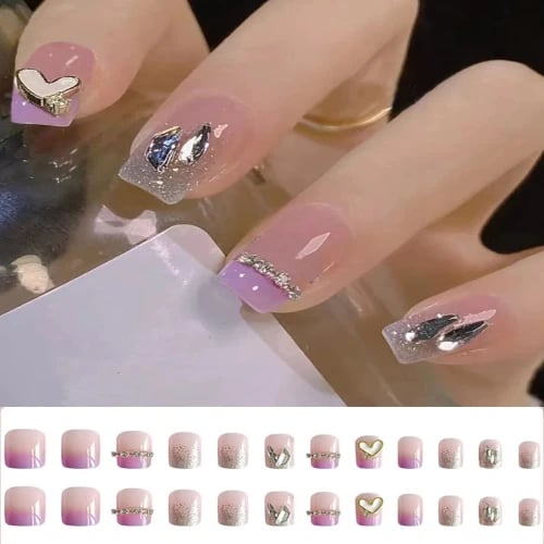 Secret Lives® acrylic press on nails translucent artifical designer fake nails extension glossy light pink mauve with 3D heart studs crystals 24 pieces set with manicure kit