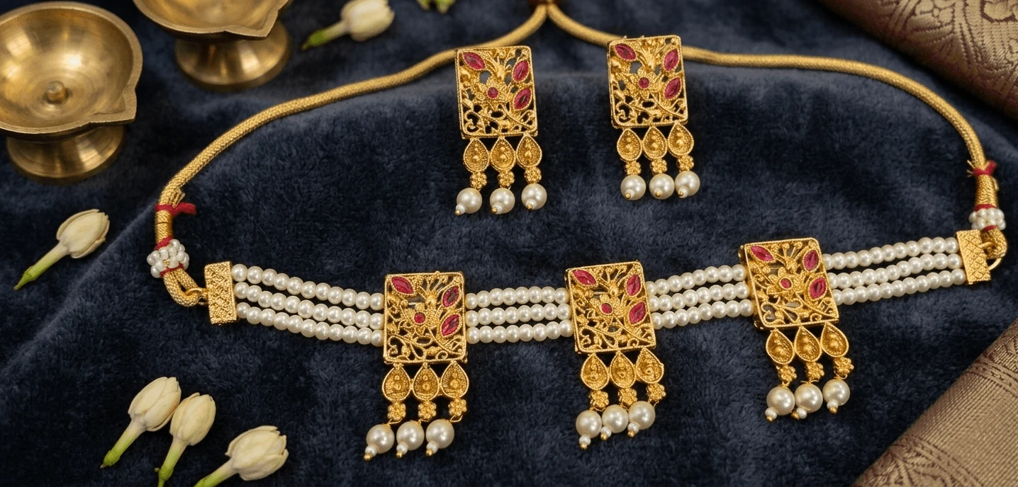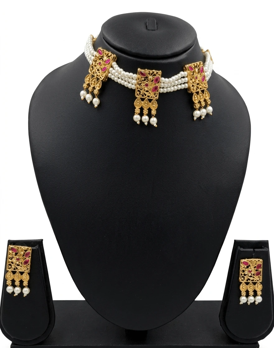 Traditional Gold Plated Pearl Choker Necklace Set with Pink Stones for Women