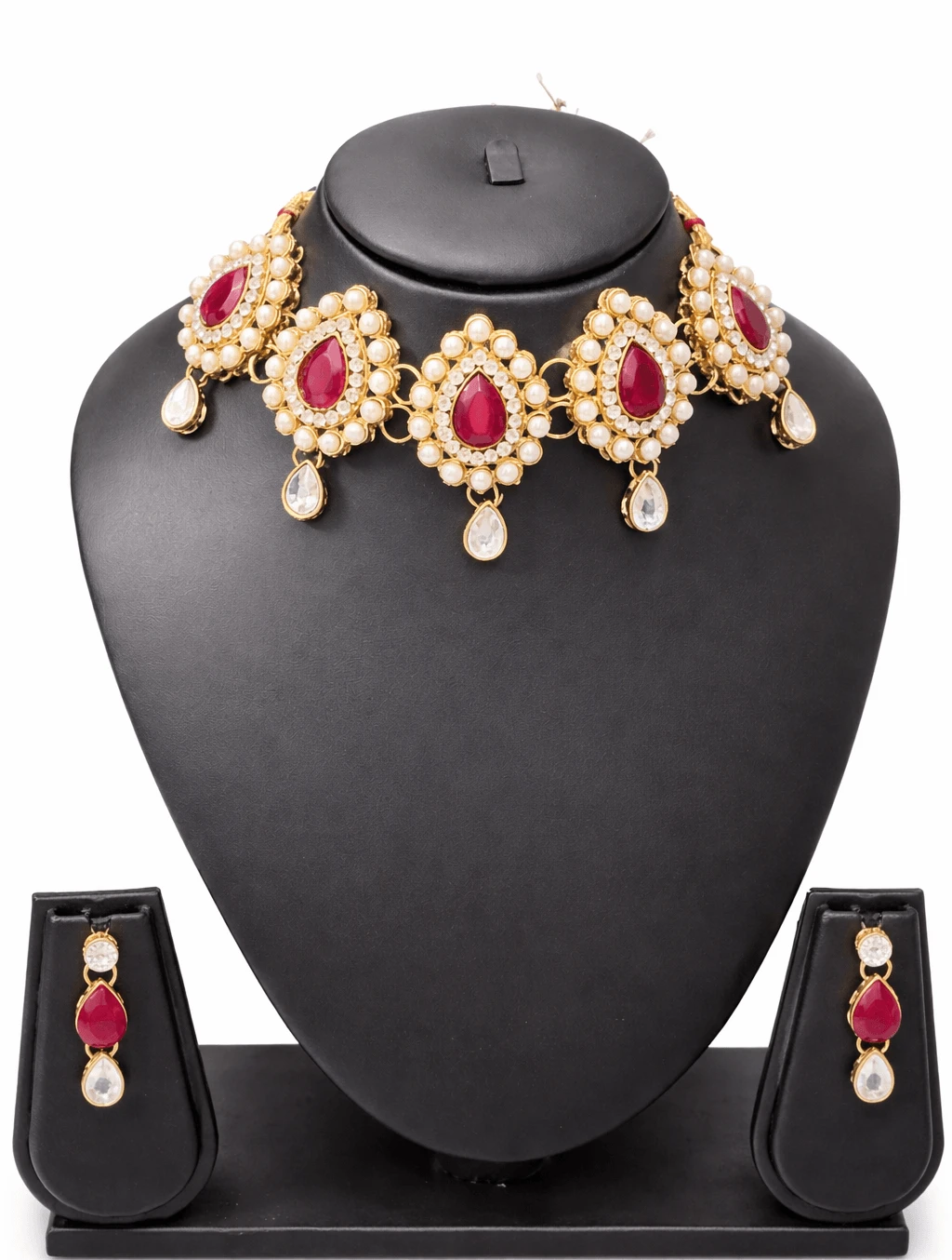 Gold Plated Red Stone Choker Necklace Set for Women - Wedding & Party Wear