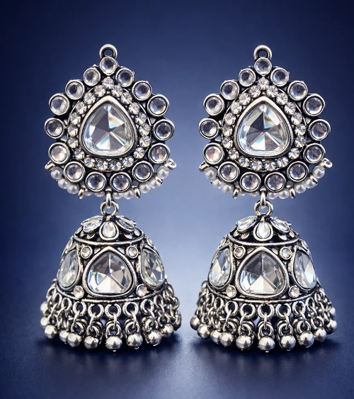Name: Stone Oxidised Silver Jhumka Earrings - Party Ethnic