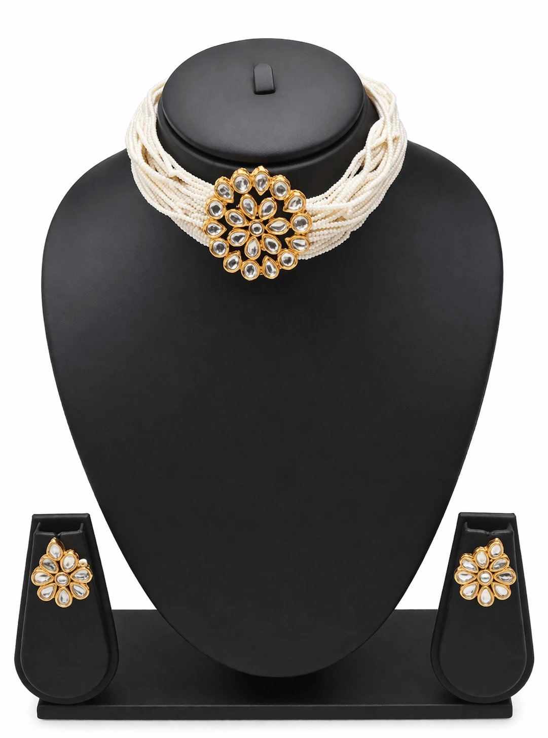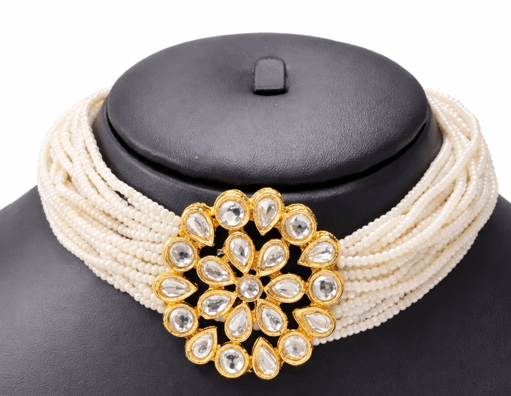 Traditional Multi-Strand Pearl Choker with Floral Kundan Pendant & Earrings
